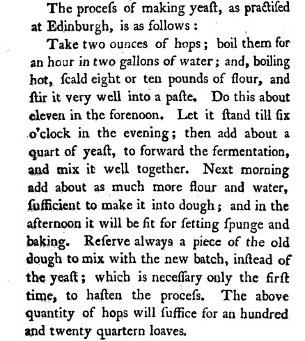The process of making yeast as practised at Edinburgh is as follows: Take two ounces of hops boil them for an hour in two gallons of water and boiling hot scald eight or ten pounds of flour and stir it very well into a paste.  Do this about eleven in the forenoon.  Let it stand till fix o clock in the evening then add about a quart of yeast to forward the fermentation and mix it well together.  Next morning add about as much more flour and water sufficient to make it into dough and in the afternoon it will be sit for setting spunge and baking.  Reserve always a piece of the old dough to mix with the new batch instead of the yeast which is necessary only the first time to hasten the process The above quantity of hops will suffice for an hundred and twenty quartern loaves.