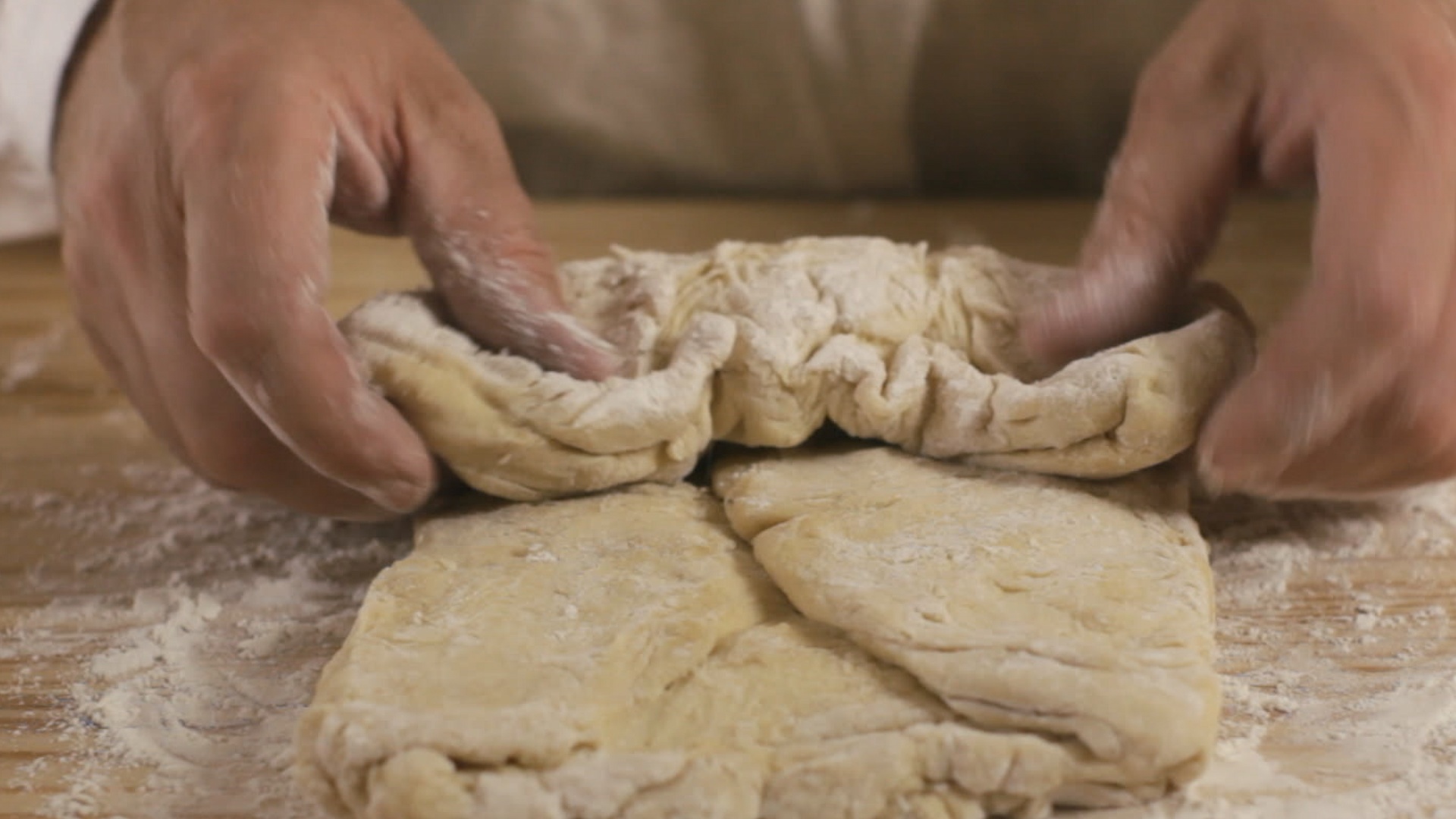 Choose one of the short ends and fold it over about 1/3 of the distance to the far edge, slightly stretching the dough as you lift up and fold.