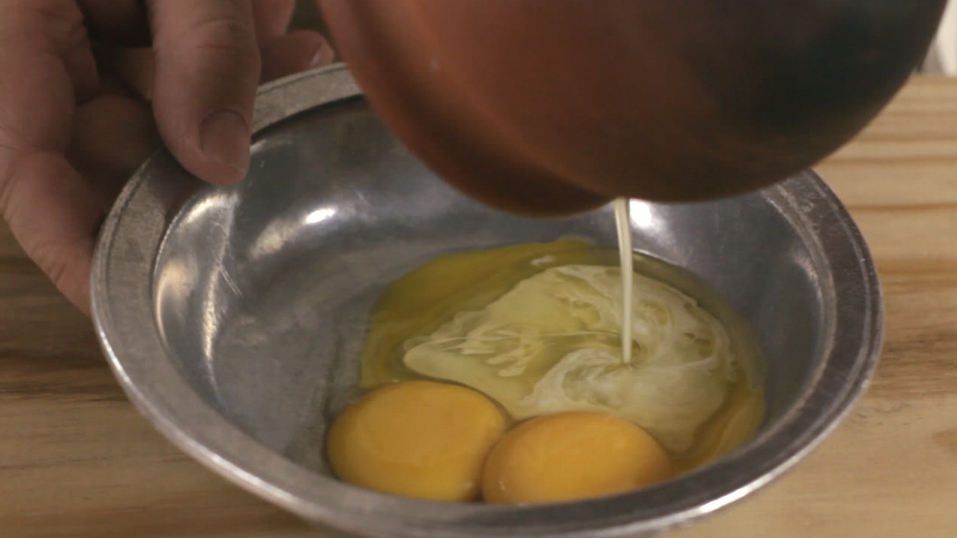 In a separate bowl, whisk together 3/4 to 1 cup milk with 1 egg white. In yet another bowl, whisk together 2 Tablespoons butter (just melted and not too hot, lest you cook your yolks) with 2 egg yolks. Finally, stir together the milk mixture and yolk mixture. Stir in your “barm” as well.