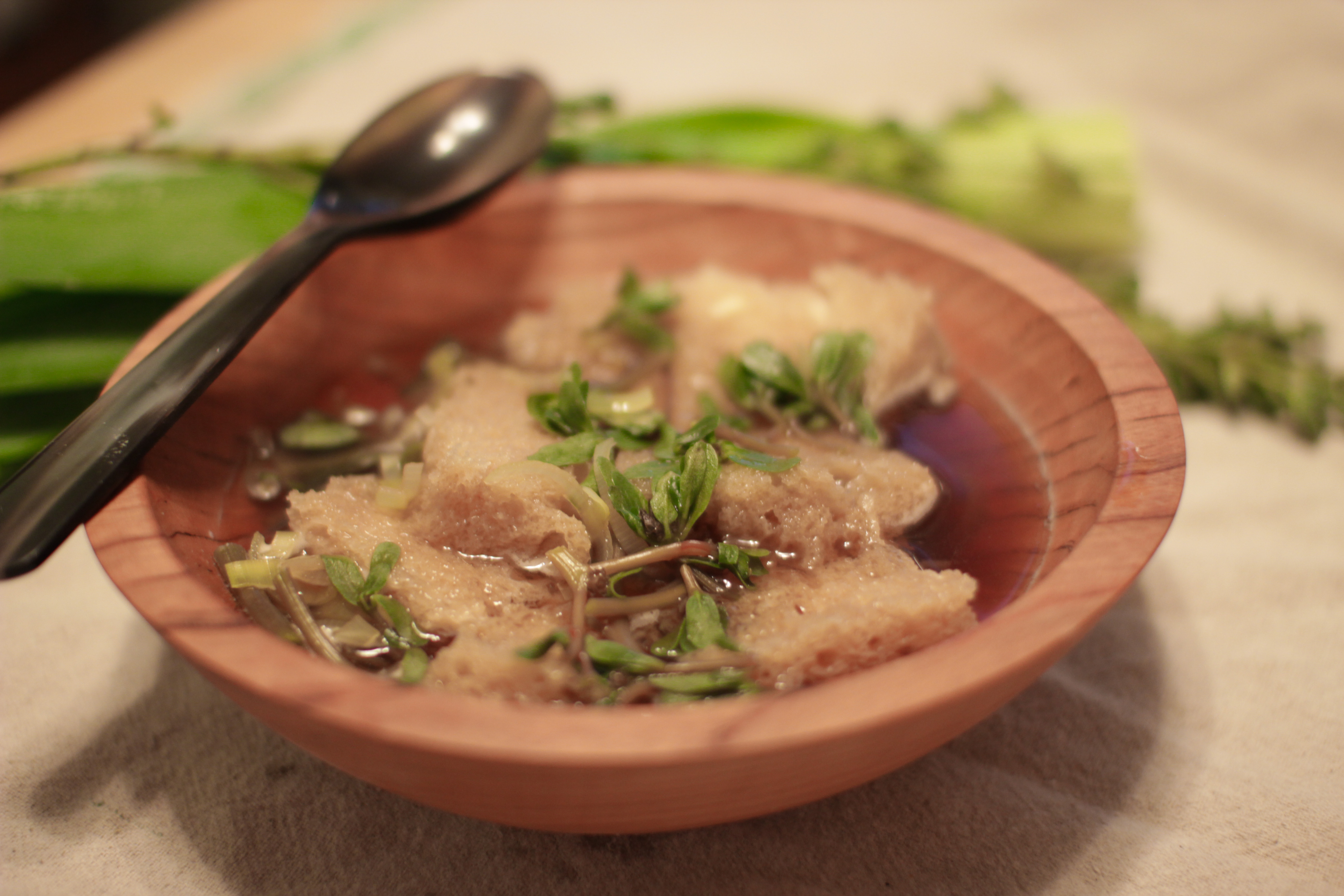 A nice bowl of simple soup made of beef broth, leeks, and morning purslane, seasoned with salt and pepper, and served over croutons of hearty bread.