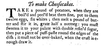 This “cheesecake” is easy and tasty.  As you can see from the above recipe from Eliza Smiths 1739 “The Compleat Housewife”, it is basically a 1/3 potato, 1/3 egg and 1/3 butter tart with some sugar and nutmeg added for flavor.