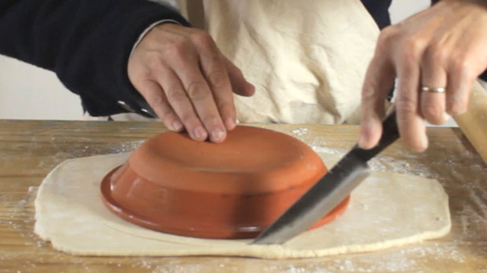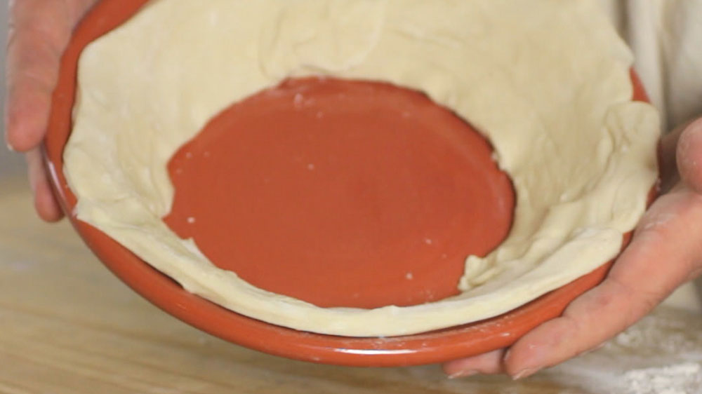 crustTurn your pan back over, and with the larger scraps of pastry, line only the walls (not the bottom) of your pan, keeping the pastry about 3/8″ thick.