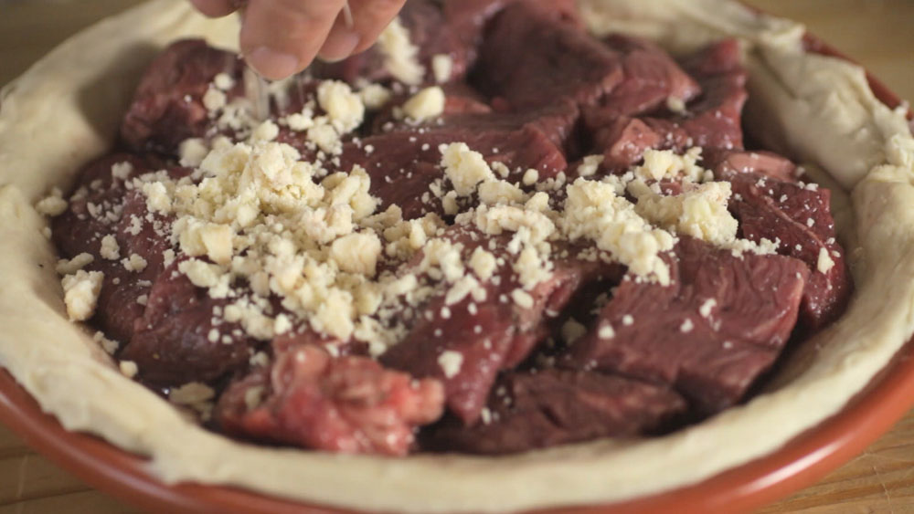 suetFill your pastry-lined dish with your meat mixture. Top the meat mixture with the suet or butter. (If you are planning to use suet, be sure to first read our post on what suet is and what it is not.) Finally, cover the meat with the pastry round, and replace the plug that was cut from the center hole.