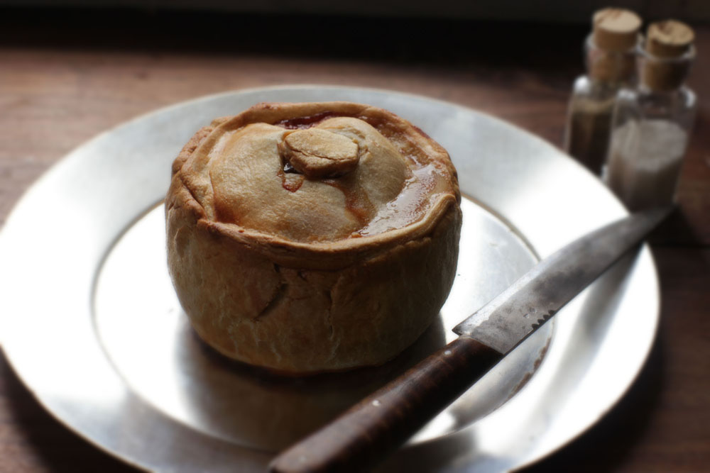 “…our Housewife takes [the pieces of meat], and chops them into Bits, about the Bigness of a Pidgeon’s Egg; then peppers and salts them pretty high, for at this Time of Year this is more than ordinarily necessary to be done, because these Pyes or Pasties are to be kept for some Days for being eaten cold. This done, make a regular Mixture of the fat and lean Pieces, if there be not fat Pieces enough, the Pye will eat dry, and if there be too much Fat, it will be apt to make the Harvest-men sick. Now with these fleshy and bony Bits of Meat, several large Pyes may be made, and baked, either in raised Paste, in earthen Pans, or in pewter Dishes, or in the Shape of turnover two-corner’d Pasties, and thus they become a most necessary and convenient Food at this Time of Year, for Farmers Families in particular, because the cold Pyes and Pasties are a portable, wholesome, and satiating Victuals for Breakfast or Dinner.”