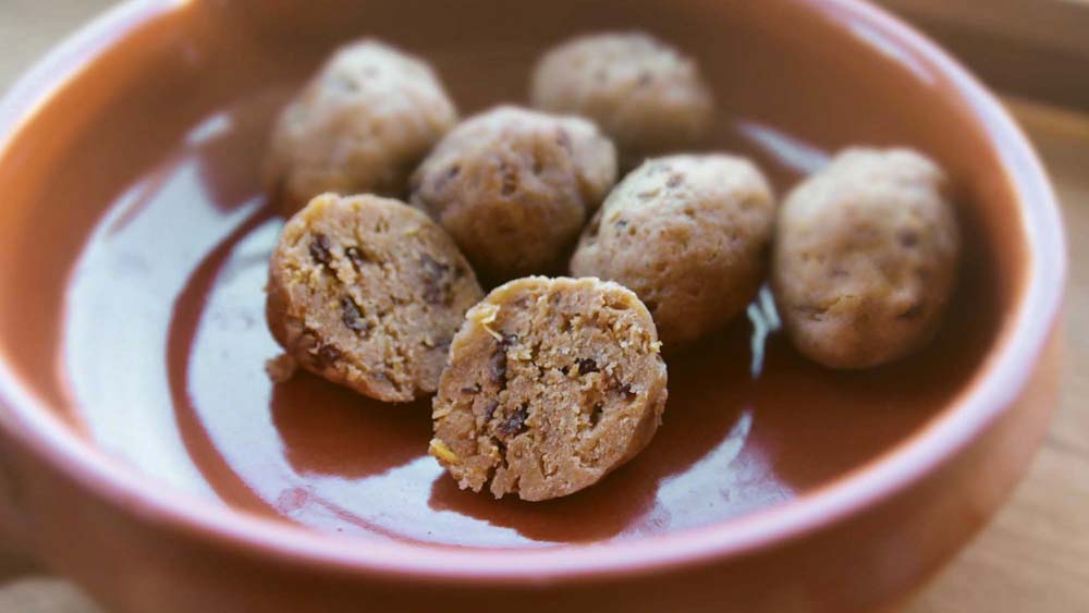Whisk together the eggs along with the ginger. Mix the dry ingredients and wet ingredients together. Divide the stiff dough into equal portions, and form into balls or dumplings about the size of a small chicken egg. Roll each dumpling in flour and lower them into your boiling water.