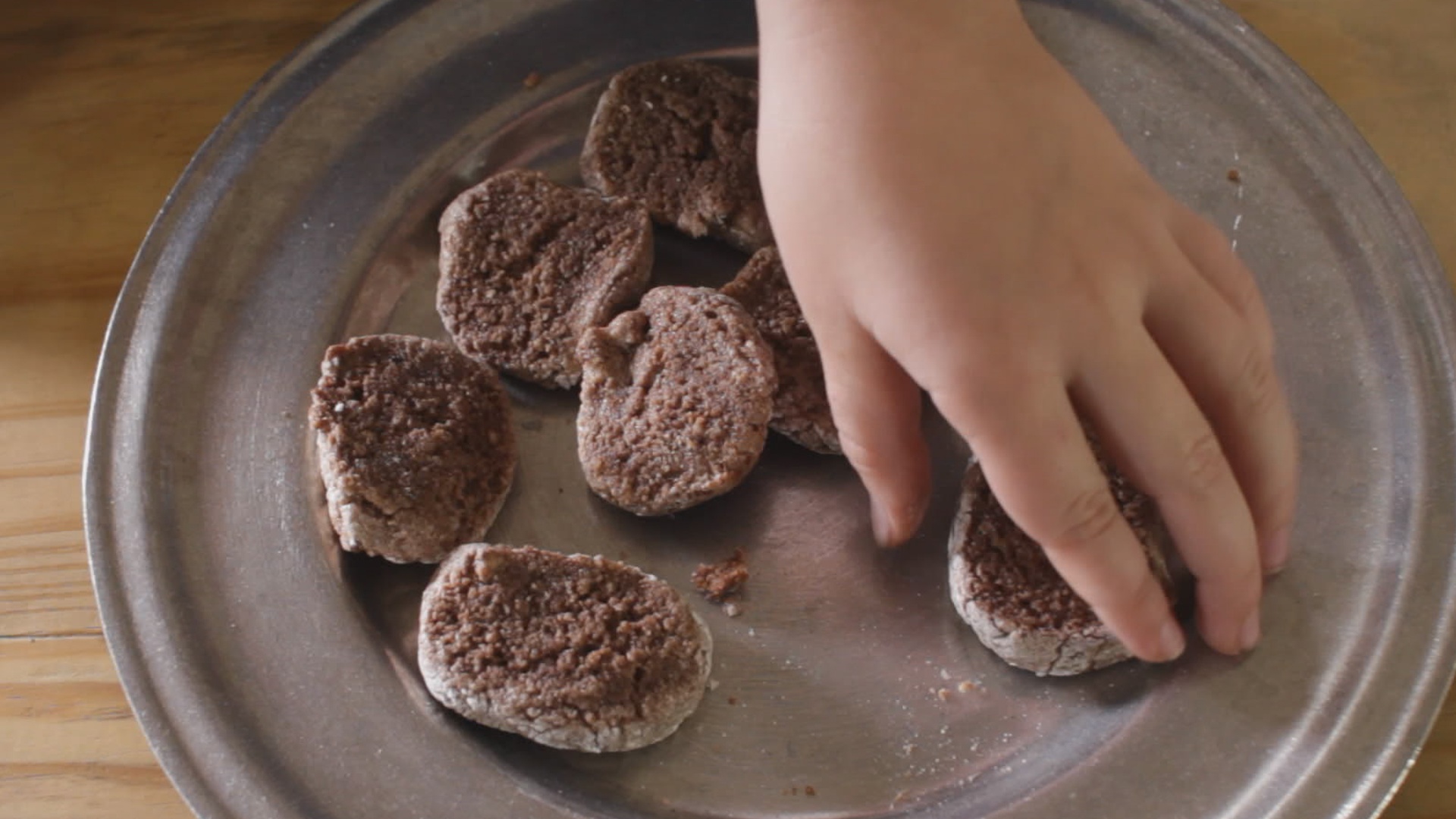 Next, cut the log into thin wafers, about 1/4″ thick. You can do this very effectively by crossing the blades of two sharp knives like a pair of scissors and giving them a quick zip through the log. Be sure to wipe your blades clean after every couple of zips.