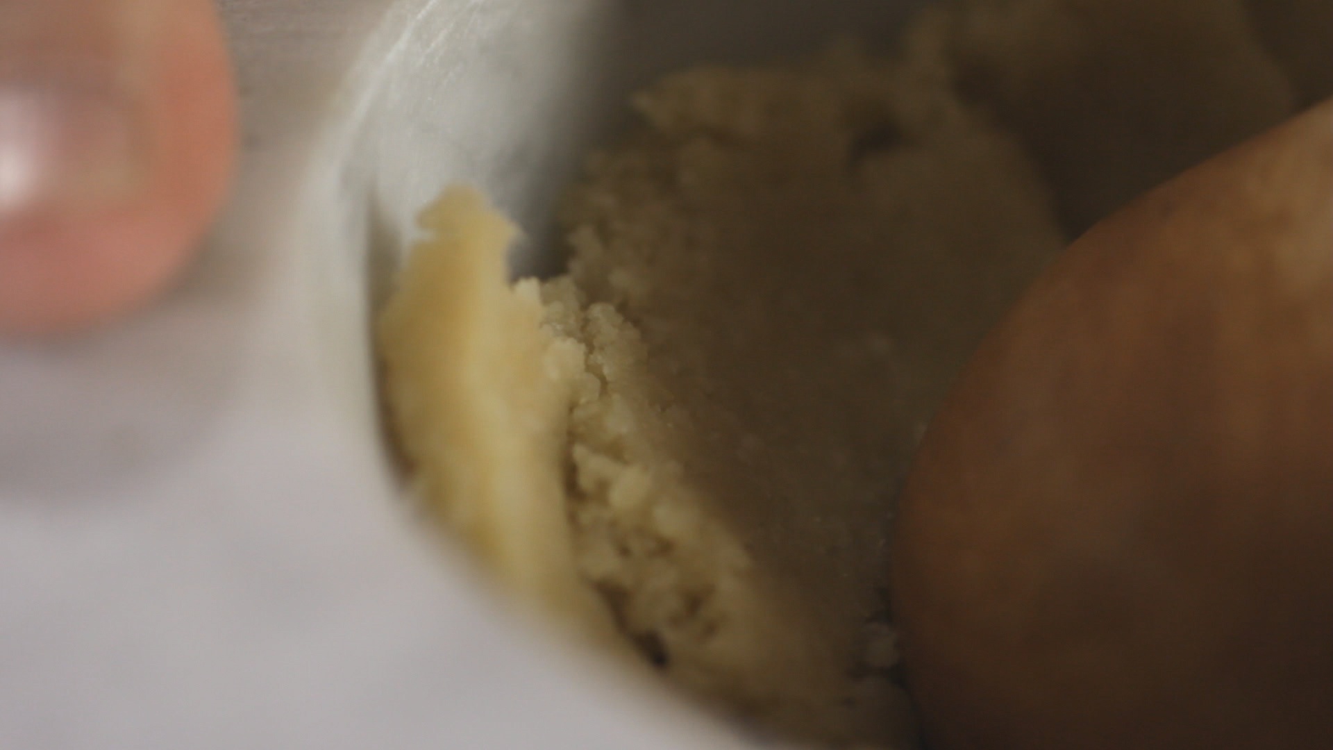 Next, using a large heavy mortar, and working in smaller batches (as opposed to the entire 1/2-pound batch all at once like we did in the video), combine your blanched almonds with a total of about 1/2 a medium egg white. By the way, if you watch the video, don’t believe the suggestion about using a heavy bowl and spoon. Nope, it ain’t gonna happen. It’s not Jon’s fault, I wrote the script. If you want to make almond paste using this method, but you don’t have a mortar and pestle, borrow one from your neighbor. If your neighbor doesn’t have one, skip to method 2., below.