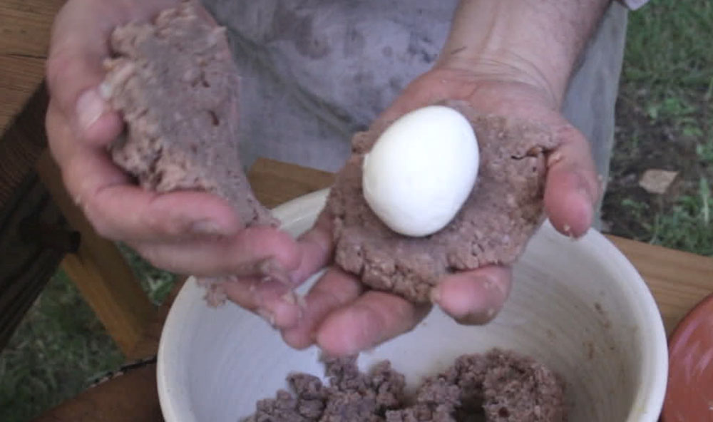 So with our version, we followed her advice by letting ham be the predominate meat. We did not follow her advice, however, on the addition of fat. Some cookbooks indicate that lean meat should be combined with either suet or bacon fat — some recipes suggest in equal proportions. Pulverizing the meat with the fat is frequently recommended. Without the added fat, we found that pulverizing was absolutely necessary. If you attempt to do this with diced ham, it likely won’t adhere to the boiled egg. If you wish to pulverize your ham in a mortar and pestle, more power to you! If you’re making these at home, I suggest you plug in your food processor instead. Use a half pound of ham. [Contrary to what we said in the video, we mistakenly used a full pound. We were eventually forced to add another egg yolk along with a little editing magic.]