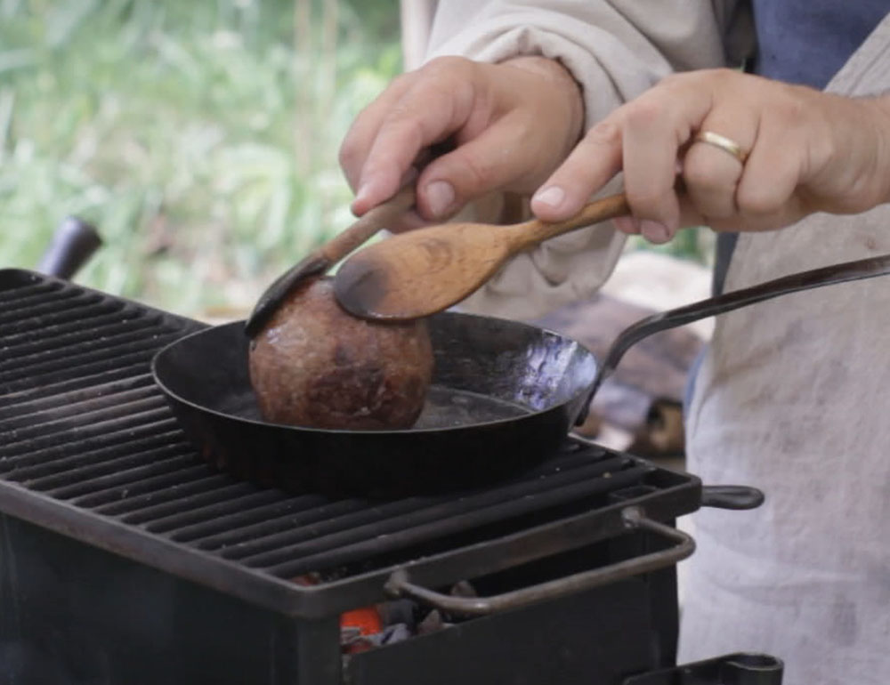 At this point, you can also roll the Scotch egg in additional bread crumb if you wish. Our friend, Michael, chose to pan fry his Scotch eggs on a brazier. The ham was already fully cooked. You can also deep fry Scotch eggs, which is how I have always had them.