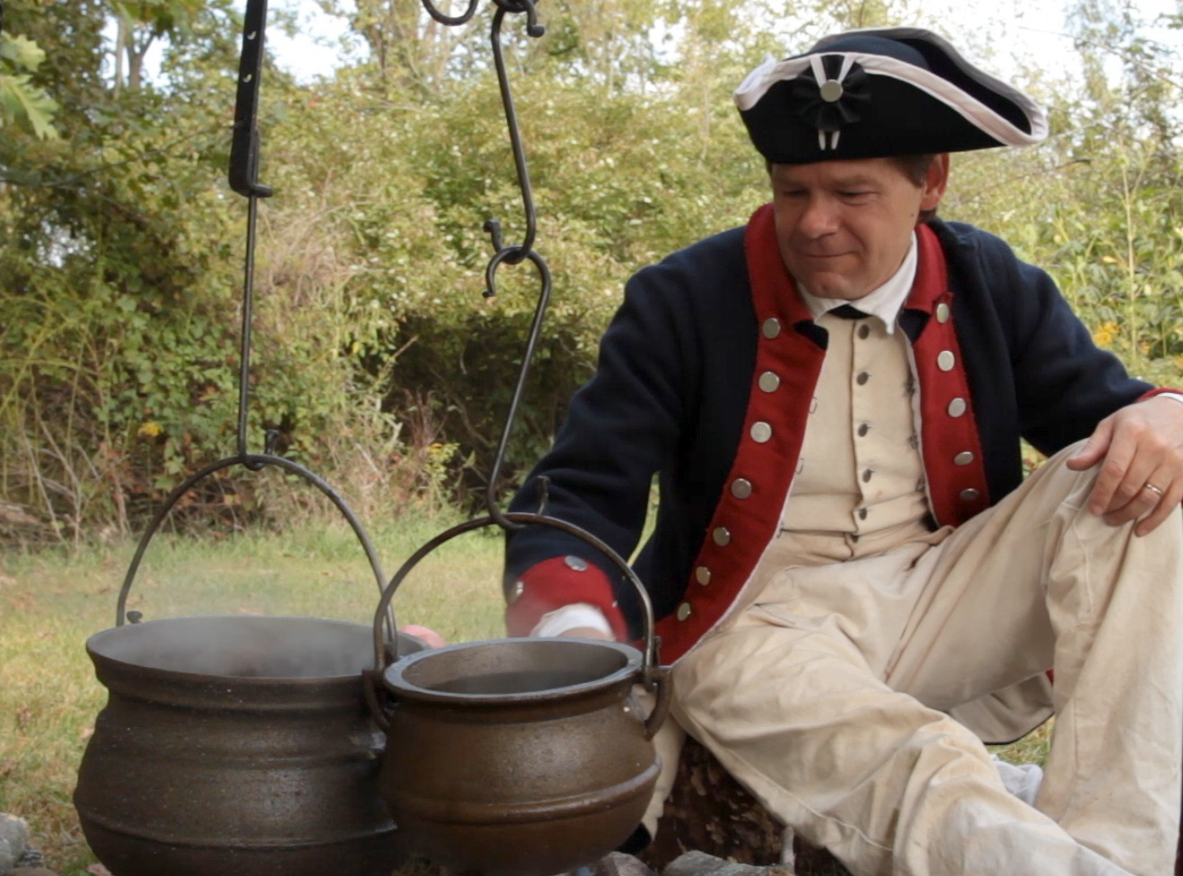 So today we’re going to take a common soldiers ration and we’re going to turn it into three different meals, a soup, a stew and a hash. The foundation of our stew and our hash, we’re going to use salt pork, and the foundation for the stew, we’re going to use fresh beef. So the salt pork we’re using today is a salt pork that we prepared in an 18th century manner. When it’s time to use the salt pork, you have to soak it. You have to take several hours, soak it in water, change the water out, soak it again, until it’s ready to use. If you don’t soak it several times and get all the salt out, it’s inedible. So, the big difference between a soup and a stew is how much water we use when we prepare it, and the first thing we have to do is to get this water going, get it boiling. I’ve got 6 pints of water starting to boil here for the soup, and I’ve got 3 pints for the stew. Let’s start out with our soup.