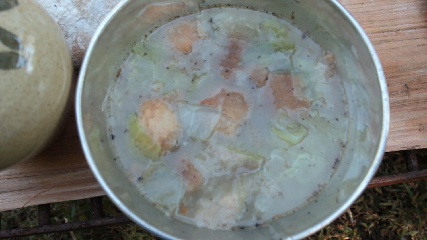 Well, there we have all three dishes finished. We’ve got a salt pork soup and the salt pork really has a wonderful flavor. The saltiness balanced out with the other flavors actually extremely good. Here’s our salt pork hash. It may not look great but let me tell you, it is my favorite on the table here, the salt pork, very tender, just the right amount of saltiness, along with the potatoes and the onions, definitely a favorite. So the last dish here was the stew, this is the beef and peas stew and it thickened up rather nicely. The peas add their own kind of sweetness to it. The beef is excellent in here. Any one of these things you will definitely enjoy.